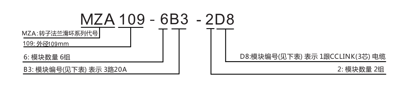 *比如MZA109-6B3-2D8, 其中6B3-2D8是指:6组3路20A(即18路20A)+2组1根CCLINK(3芯)电缆
